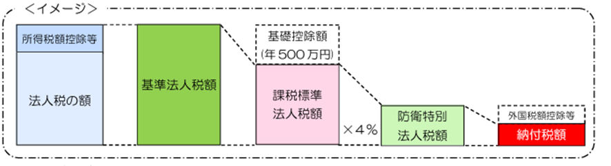 ③各課税事業年度の課税標準法人税額に4%の税率を乗じた金額が防衛特別法人税の額となります。