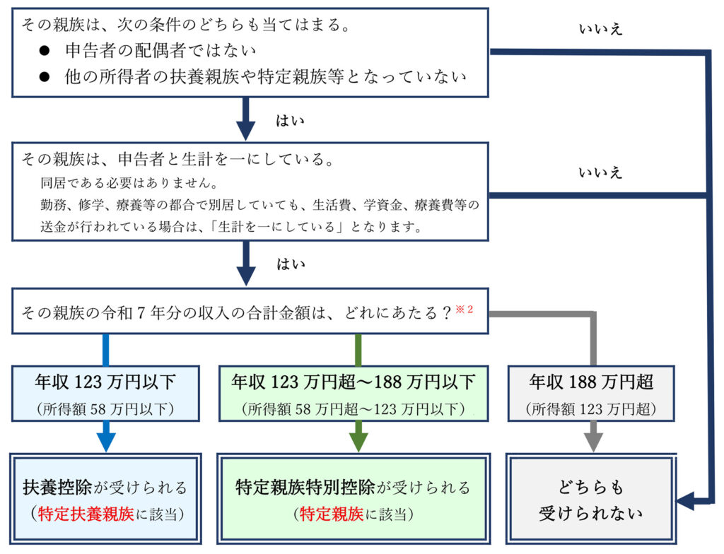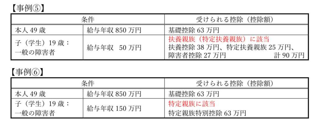 「特定親族特別控除」を受ける場合は、その親族は「扶養親族」に該当しないため、「障害者控除」「特別障害者控除」の要件を満たさなくなり、これらの控除は受けられなくなります。