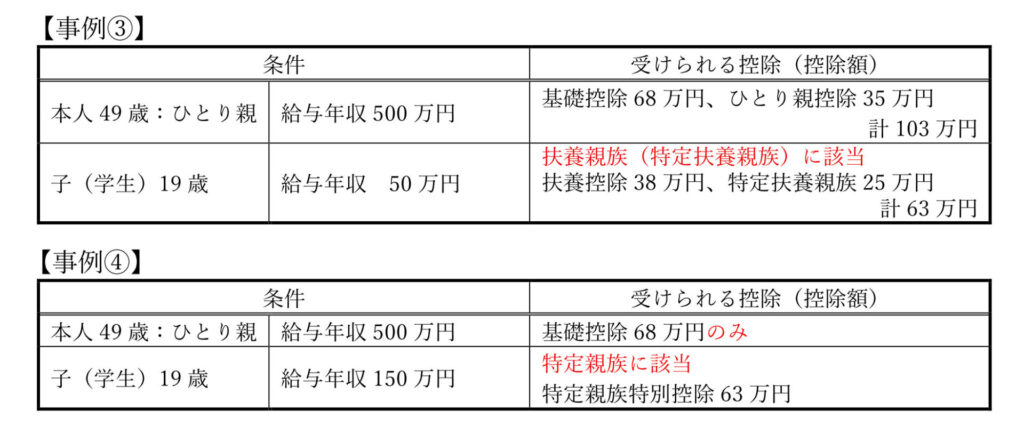 「特定親族特別控除」を受ける場合は、その親族は「扶養親族」に該当しないため、「ひとり親控除」「寡婦控除」の要件を満たさなくなり、これらの控除は受けられなくなります。