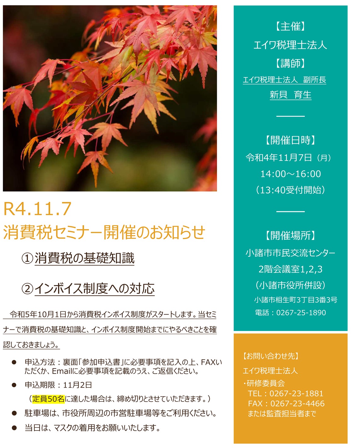 2022.10.12 セミナー 令和4年11月7日開催 消費税セミナー ❶消費税の基礎知識 ❷インボイス制度への対応